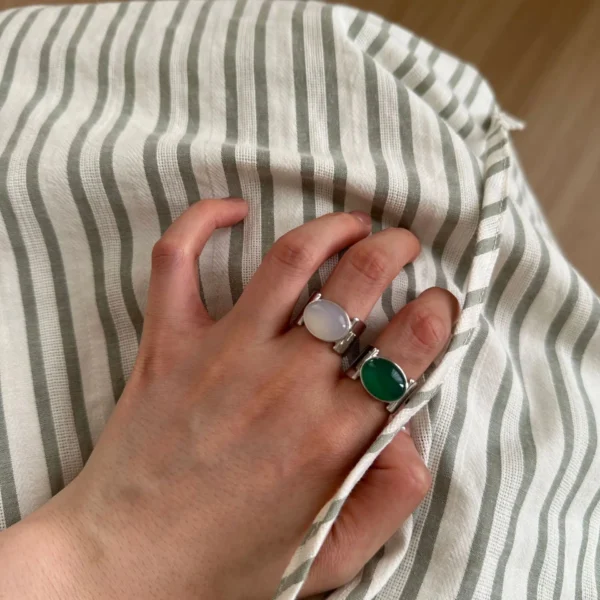 925 Sterling Silver Glossy Oval Green Agate Ring W...