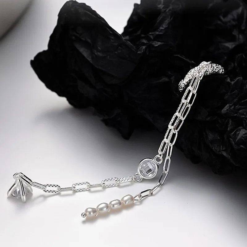 MLKENLY S925 sterling silver Diamond studded chain tassel pearl ear clip, female irregular texture long ear cuff