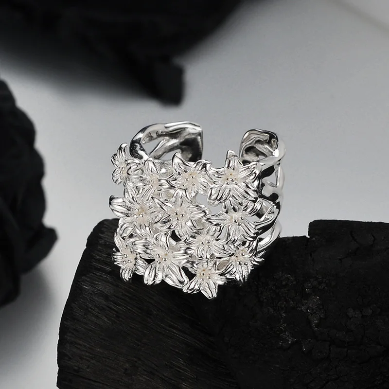 MLKENLY S925 sterling silver Flower Flower Ring Female Ins Cold Wind Open Wide Version Flower Finger Ring