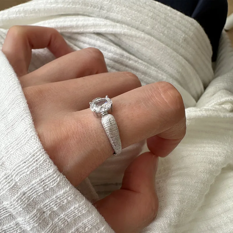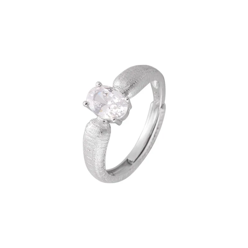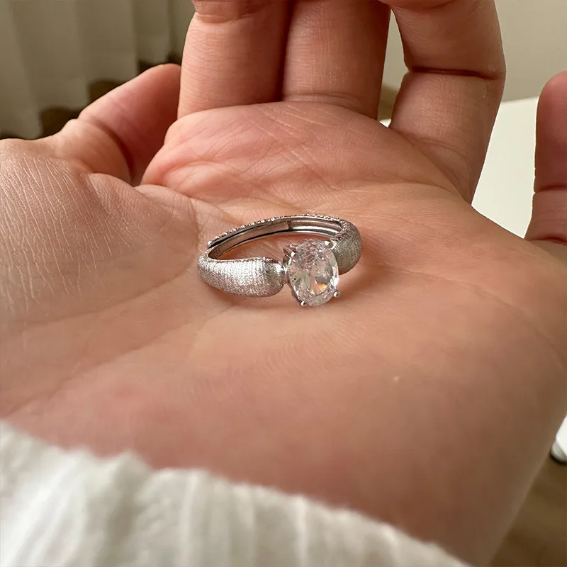 S925 Sterling Silver Frosted Brushed Ring with Diamonds, Simple Medieval Personality Niche Light Luxury Adjustable Ring 0149A