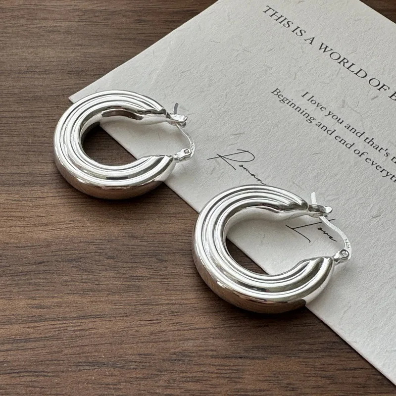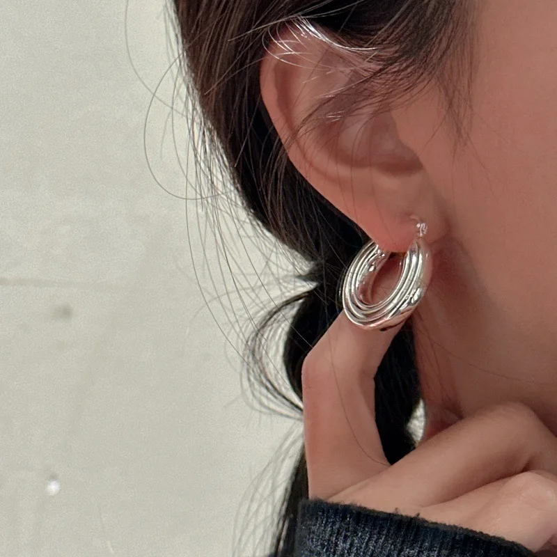 S925 Sterling Silver Korean Version Niche Design Sense Hollow Craft Striped Earrings Retro INS Style Simple Ear Jewelry