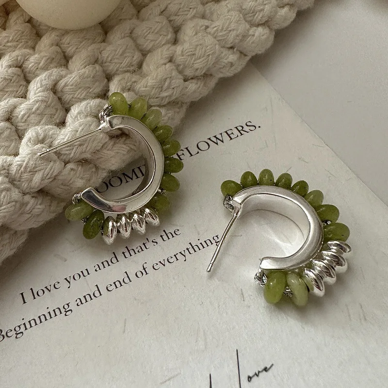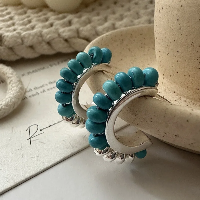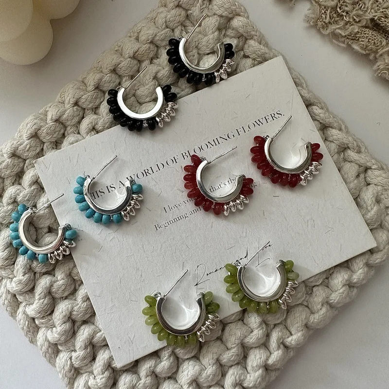 S925 Sterling Silver Korean Version Niche Design Sense Retro Handmade Beaded Earrings European Style Color Ear Jewelry