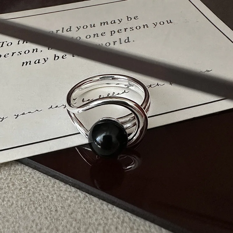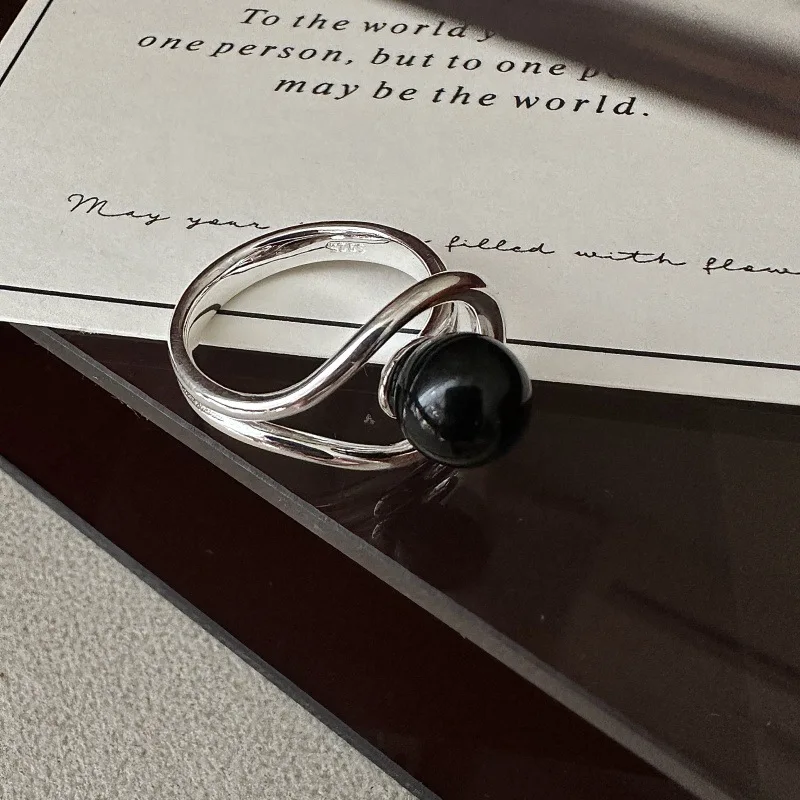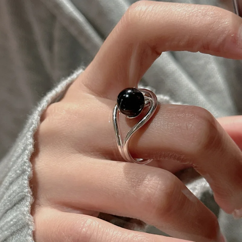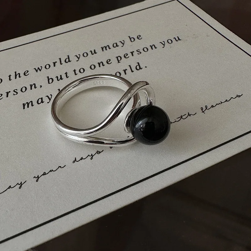 S925 Sterling Silver Spanish Niche Design Black Agate Bead Ring American Style Basic Personalized Ring Wholesale